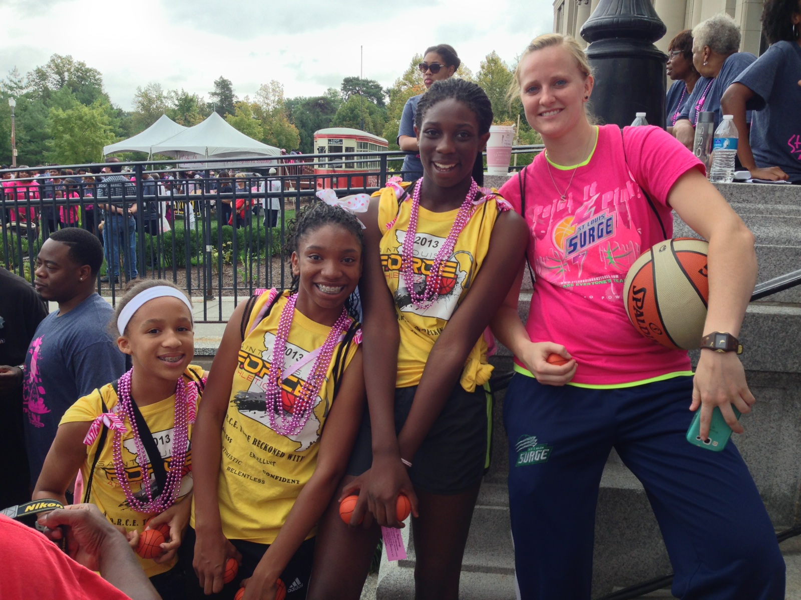 Representatives of the St. Louis Surge Women’s Basketball Team and the St. Louis F.O.R.C.E. Athleticz Girls Basketball Team, participated in the Annual 3K Breast Cancer Walk - St. Louis Sista Strut on Saturday, October 5, 2013, in Forest Park at the Missouri History Museum. Sista Strut is the largest walk of its kind in the nation to support women of color in an effort to support the community of St. Louis. The walk attracted more than 8,000 walkers. All contributions raised support local charities in St. Louis.